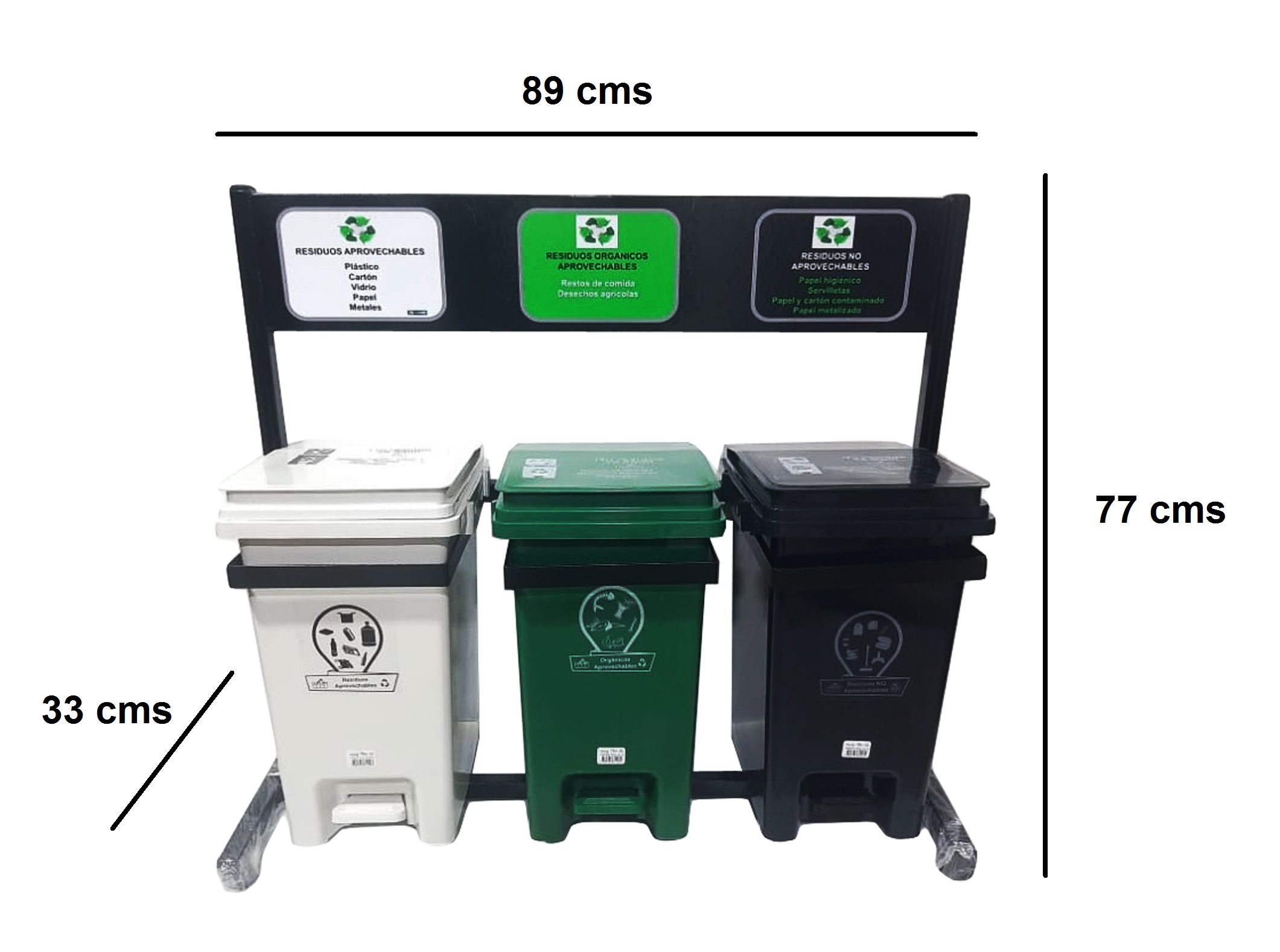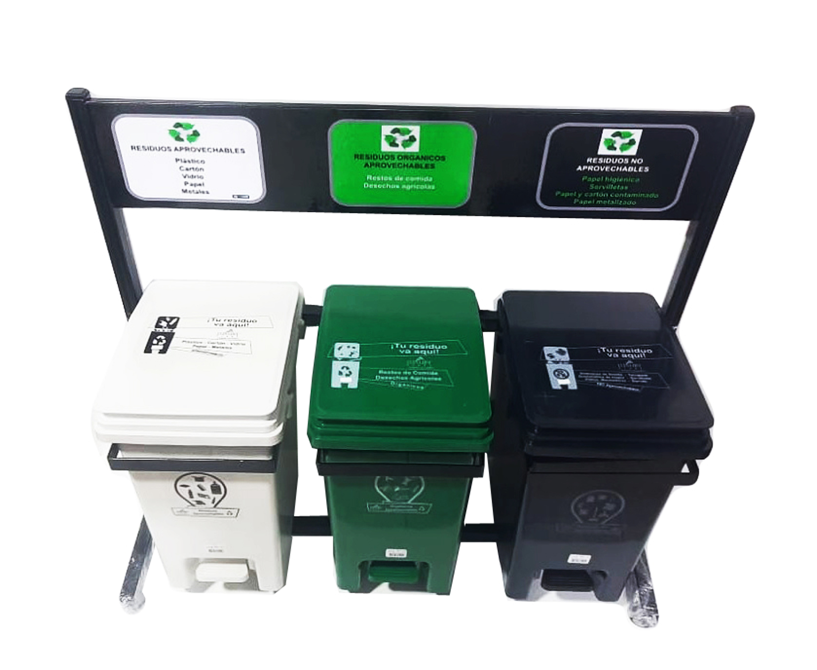 PUNTO ECOLÓGICO REGLAMENTARIO CON ESTRUCTURA METÁLICA DE TRES PUESTOS CON CANECAS DE 20 LITROS TAPA VAIVÉN (NUEVA NORMA)